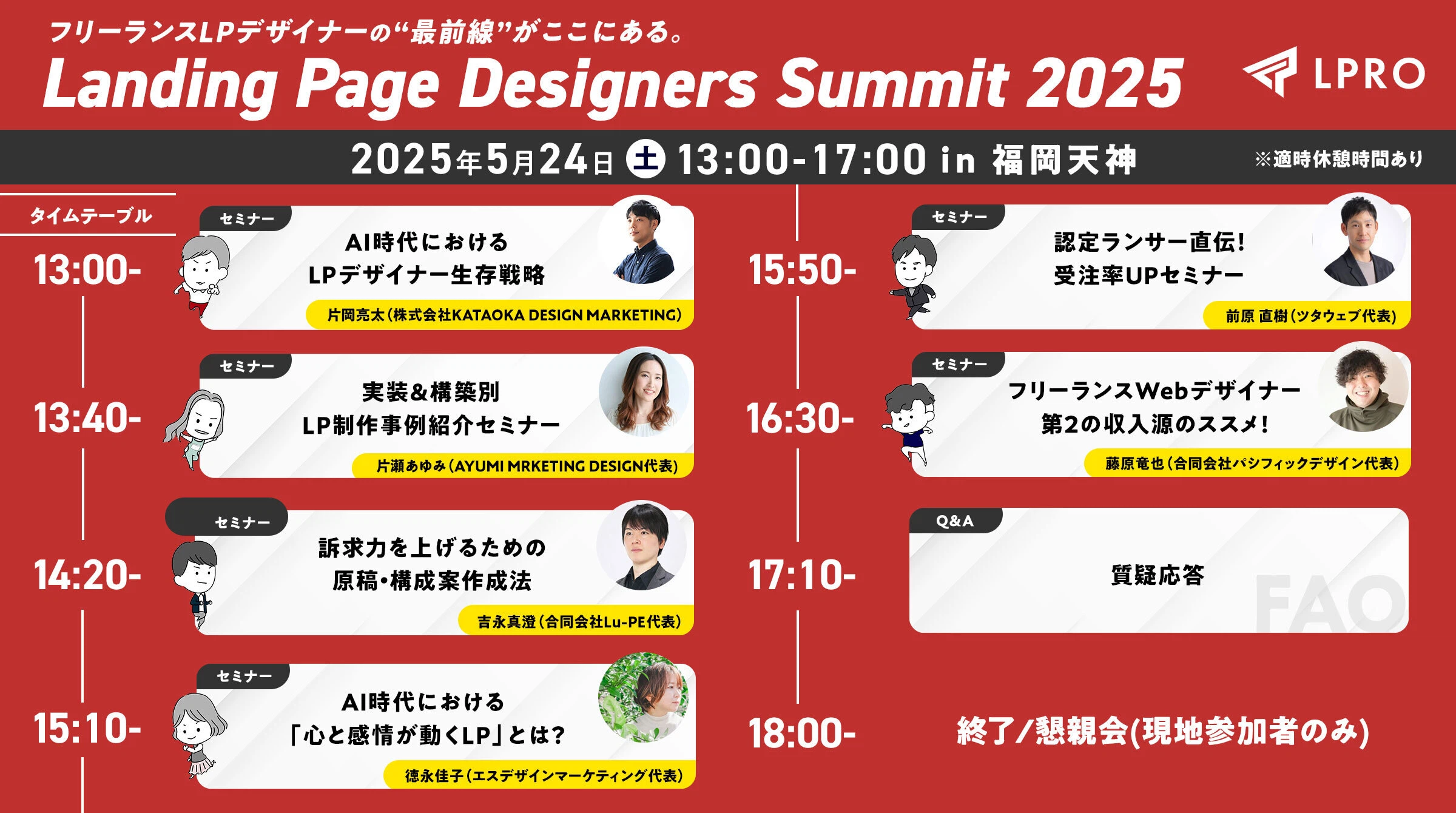 サミット当日は、各講師が30分程度の持ち時間で、普段からLP制作現場(Web制作含む)に携わる中で感じた「課題」や「変化」、そして「これから求められるスキルや考え方」について、6名の現役デザイナーの方からリアルな実体験をお話しいただきました。